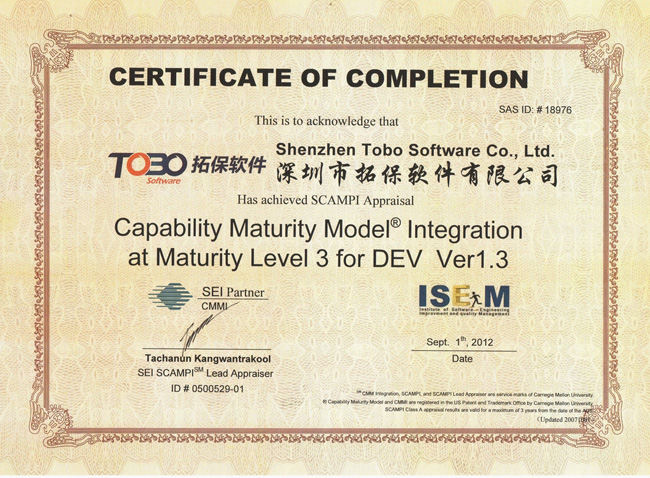 拓保于2012年8月24日至2012年9月1日启动CMMI-ML3(Capacity Matu-rity Model Integration,Level 3)正式评估活动,由SEI主任评估师Ms. Tachanun进行指导与评估工作,公司领导层以及所有IT技术人员参加此次评估,经过团队的共同努力,于2012年9月1日顺利通过了CMMI-ML3的评估认证。
